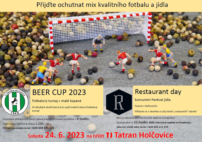 TJ Tatran Holčovice v sobotu 24.6.2023 pořádá obnovu několik let pravidelně známého turnaje v malé kopané BEER CUP. Při této příležitosti se uskuteční 1. ročník Restaurant day, který je určen pro širokou veřejnost a milovníky jídla. Kontakty pro registraci na jednotlivé akce jsou uvedeny na plakátu.