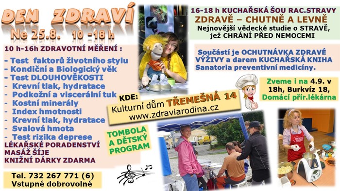 INSTITUT PRO ZDRAVÍ A RODINU o.p.s. zve občany na akci Den zdraví, která se koná tuto sobotu 25. 08. 2024 v kulturním domě Třemešná 14, od 10 do 18 hod.
