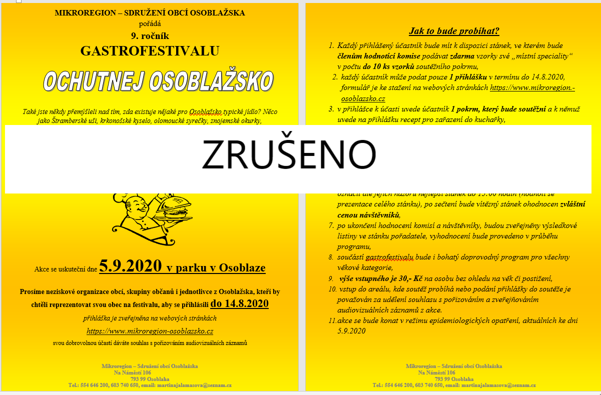 Mikroregion Osoblažsko s politováním oznamuje, že gastrofestival Ochutnej Osoblažsko 2020 byl zrušen. Důvodem je nepředvítatelný vývoj okolo koronavirových opatření.