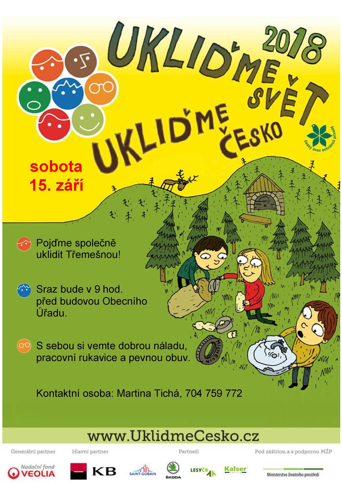 Hlavním podzimním úklidovým dnem v roce 2018 bude sobota 15. září. Celostátní akce do které je možno se zapojit také v Třemešné. Sraz účastníků je v 9hod před Obecním úřadem v Třemešné.