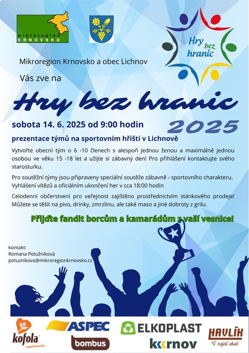 Hry bez hranic Mikroregionu Krnovsko se uskuteční v Lichnově sobotu 14. června 2025. Od 9 hodin proběhne na sportovním hřišti prezence týmů. Vytvořte obecní tým o minimálně šesti a maximálně deseti členech s alespoň jednou ženou a maximálně jednou osobou ve věku 15 - 18 let a přidejte se.