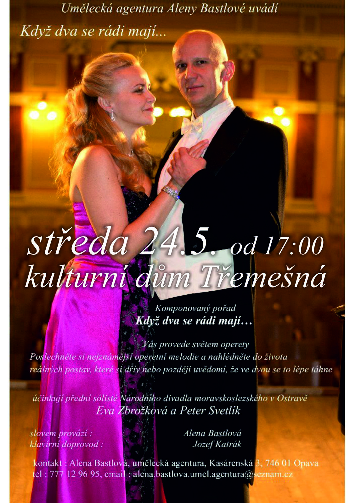 Pro posluchače operetních melodií je na středu 24.května od 17 hodin připraveno v kulturním domě vystoupení sólistů Národního slezského divadla Ostrava s názvem Když dva se rádi mají. Jedná se o komponovaný pořad provázený textem a písněmi.Vstupné dobrovolné
