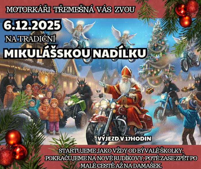 Motorkáři Třemešná Vás zvou 6. prosince 2025 (sobota) na tradiční Mikulášskou nadílku, která začíná v 17 hodin u bývalé MŠ.