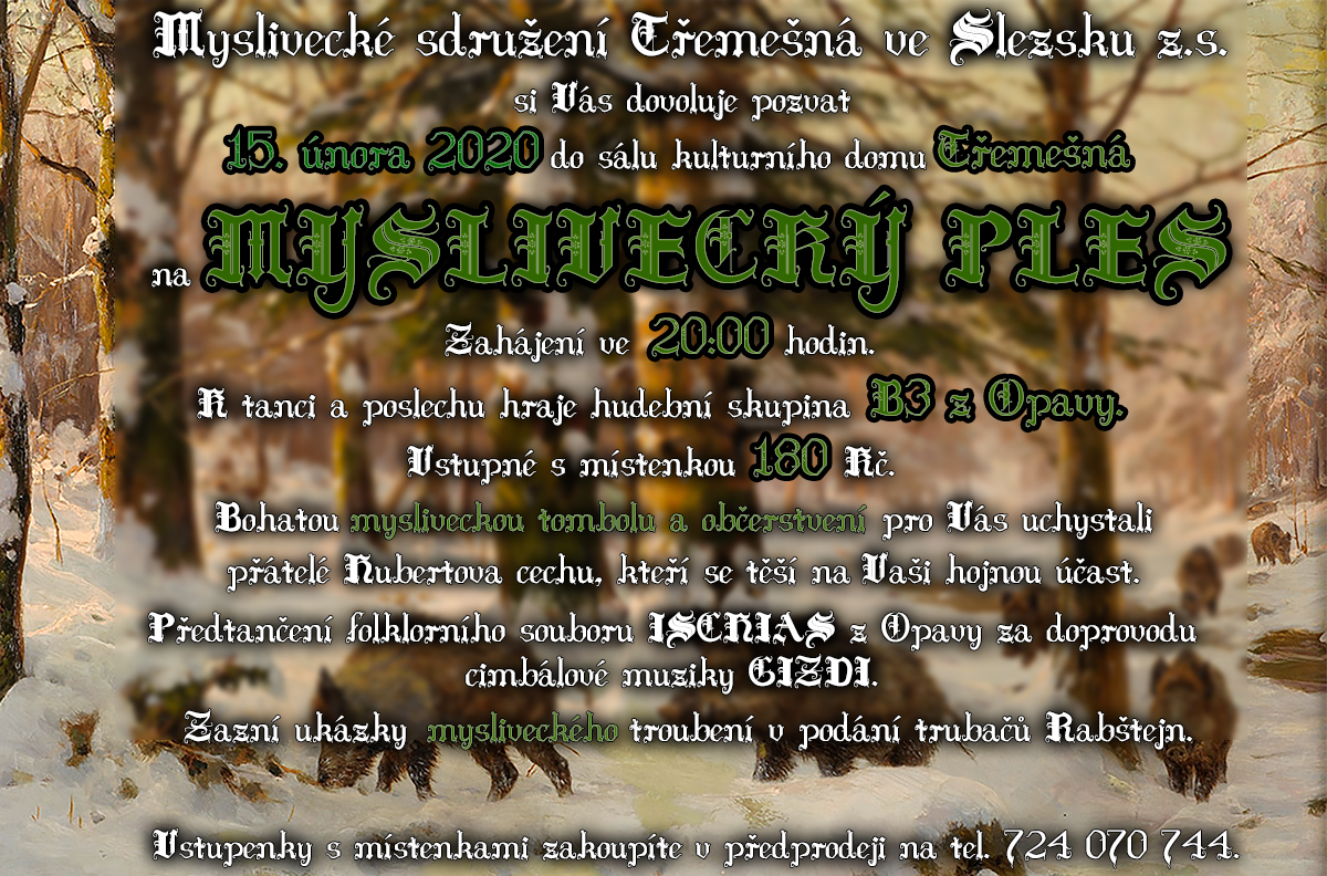 Myslivecké sdružení Třemešná ve Slezsku z.s. si Vás dovoluje pozvat na tradiční myslivecký ples, který se koná v sobotu 15. 2. 2020 v kulturním domě Třemešná. Zahájení je ve 20:00 hodin předtančením v podání folklorního souboru Ischias z Opavy za doprovodu cimbálové muziky Gizdi. K tanci a poslechu zahraje skupina P3 z Opavy - Burda, Benešová a Biner. Zazní i ukázky mysliveckého troubení v podání trubačů Rabštejn. Tradičně koláčky s chlebíčky na stolech, zvěřinovou i věcnou tombolu a bohaté občerstvení pro hosty uchystali přátelé Hubertova cechu, kteří se těší na Vaši účast. Vstupenky s místenkami za 180 Kč lze zajistit v předprodeji na mobilu 724 070 744.