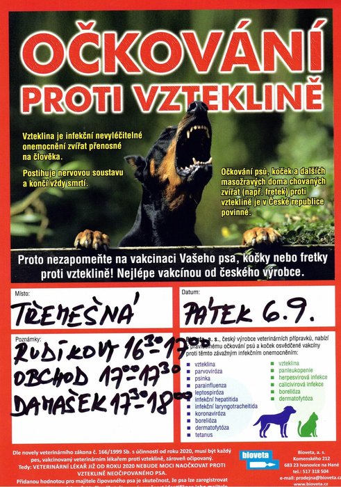 Obecní úřad oznamuje, že v pátek 06. 09. 2024 proběhne očkování psů proti vzteklině.
