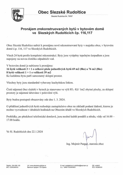 Úvod > Život v obci > Aktuality > Pronájem zrekonstruovaných bytů ve Slezských Rudolticích