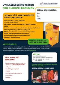 Pokud občané budou mít zájem sbírky se zúčastnit a přinést nějaké věci, nechť kontaktují starostu obce na mobilu 724 180 666, a domluví převzetí věcí.