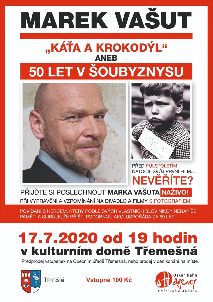 Uplynulý ½ rok nebyla možnost návštěvy divadel, a tak jsme využili příležitosti navázat na každoroční setkání s osobností z uměleckého prostředí a připravili alespoň setkání v kulturním domě s nezaměnitelným hercem doposud hlavně vedlejších rolí – Markem Vašutem. Nezmění-li se situace, uskuteční se setkání 17.7. od 19 hodin v kulturním domě Třemešná.