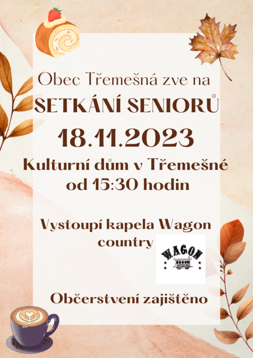 Obec Třemešná zve na podzimní setkání seniorů, konané dne 18.11.2023 od 15:30 hod. v kulturní domě. K tanci a poslechu hraje kapela Wagon country.