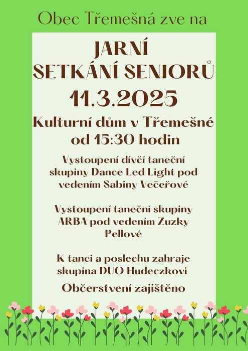 Obec Třemešná zve všechny seniory na tradiční setkání, které se koná 11. 03. 2025 v kulturním domě v Třemešné od 15:30 hodin. Vystoupí taneční skupiny Dance Led Light pod vedením Sabiny Večeřové a skupina ARBA pod vedením Zuzky Pellové. K tanci a poslechu zahraje DUO Hudeczkovi.