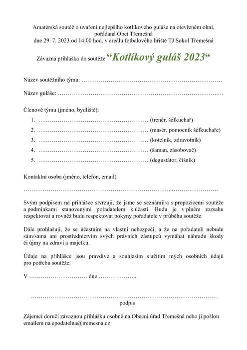 Zájemci doručí závaznou přihlášku osobně na Obecní úřad Třemešná nebo ji pošlou emailem na epodatelna@tremesna.cz