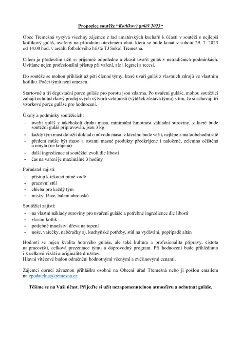Obec Třemešná vyzývá všechny zájemce z řad amatérských kuchařů k účasti v soutěži o nejlepší kotlíkový guláš, uvařený na přírodním otevřeném ohni, která se uskuteční v sobotu 29. 7. 2023 od 14:00 hod. v areálu fotbalového hřiště TJ Sokol Třemešná.