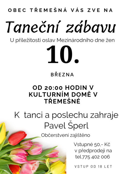 Obec Třemešná zve občany u příležitosti Mezinárodního dne žen na taneční zábavu, která se koná 10. března 2023 v kulturním domě v Třemešné od 20 hodin. K poslechu a tanci zahraje Pavel Šperl. Vstupné je 50 Kč. Předprodej vstupenek na tel. 775 402 006. Občerstvení zajištěno.