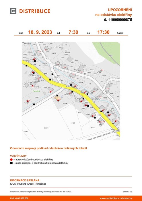 ČEZ Distribuce, a. s. informuje o plánovaném přerušení dodávky elektrické energie v územní působnosti obce Třemešná dne 18. 09. 2023 od 7:30 do 17:30 hod.