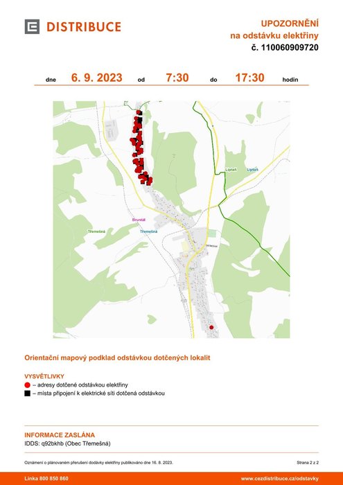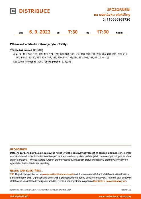 Úvod > Život v obci > Aktuality > Upozornění na odstávku elektřiny - kat. území Třemešná (kód 770647) parcelní č. 55 a 66