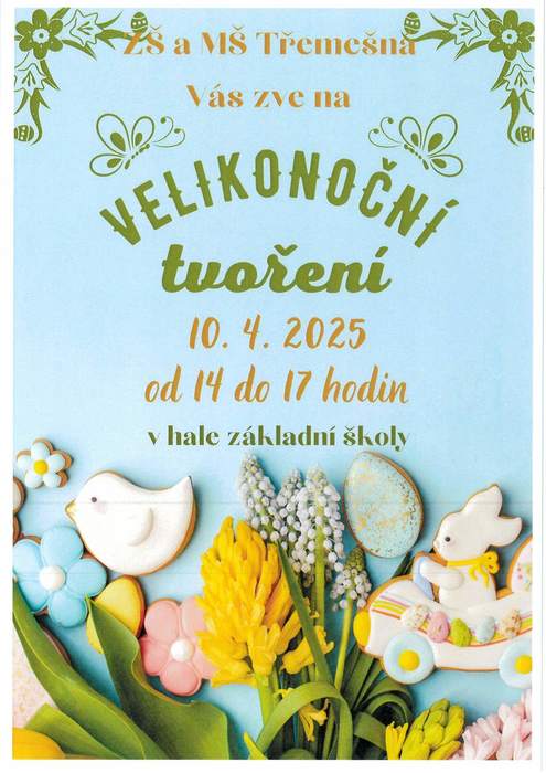 Dne 10.04.2025 proběhne v době od 14:00 hodin do 17:00 hodin velikonoční tvoření v hale základní školy Třemešná.