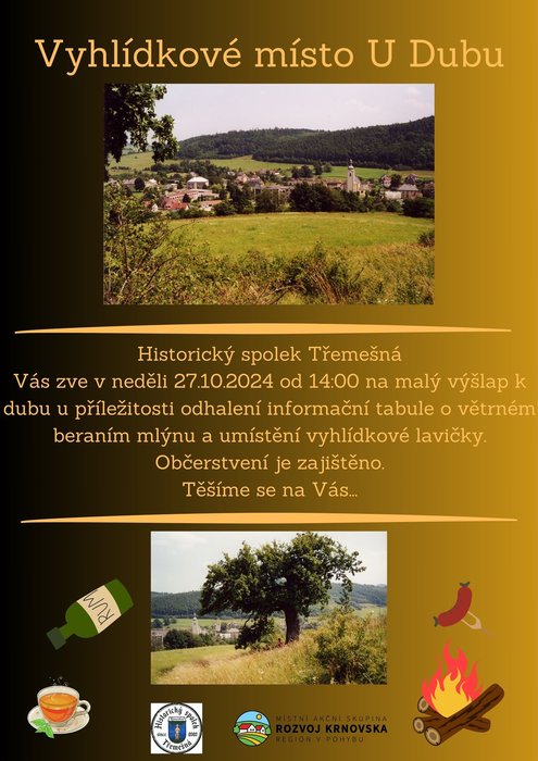 Historický spolek Třemešná Vás zve v neděli 27.10. 2024 od 14:00 na malý výšlap k dubu, u příležitosti odhalení informační tabule o větrném beraním mlýnu a umístění vyhlídkové lavičky. Malé občerstvení je zajištěno. U debaty nejen o historii se na Vás těší Historický spolek.
