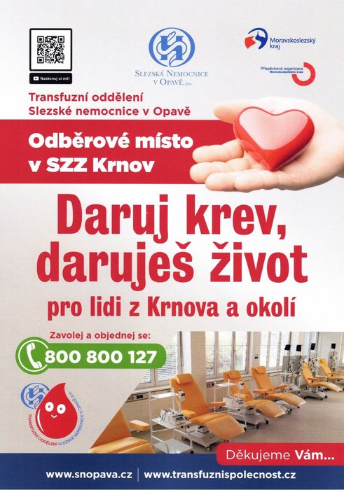 Výzva pro dárce krve Tranfuzního oddělení Slezské nemocnice v Opavě, odběrové místo v SZZ Krnov.